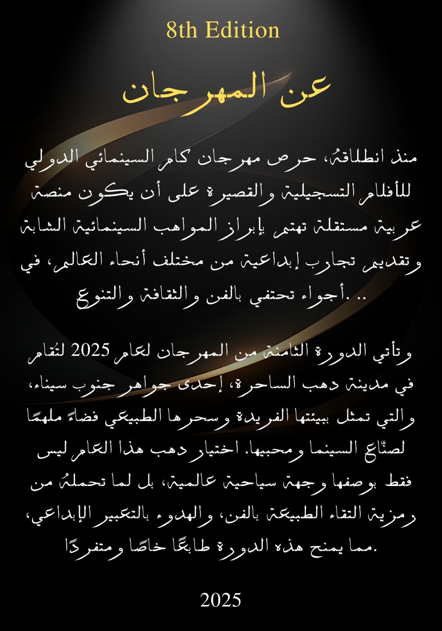 ويأتي المهرجان في مدينة دهب الساحرة ليمنح المشاركين والجمهور فرصة للقاء مباشر مع تجارب سينمائية متنوعة من مختلف أنحاء العالم، في إطار من الحوار الثقافي وتبادل الخبرات.