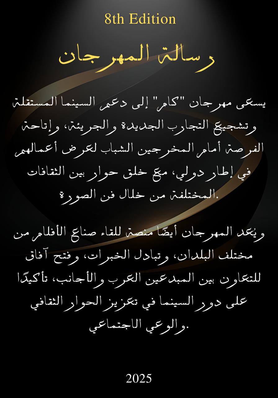 ويعد مهرجان كام أحد الملتقيات الفنية المهمة التي تسلط الضوء على إبداعات صناع السينما الشباب في مجال الأفلام القصيرة، ويهدف إلى دعم المواهب الجديدة وإثراء الحركة السينمائية المستقلة في مصر والعالم العربي .