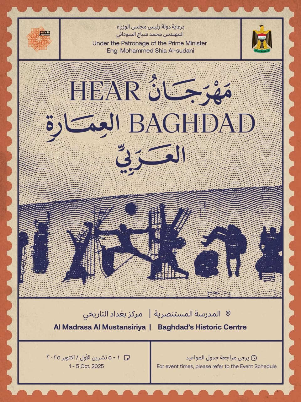 تحت رعاية رئيس وزراء جمهورية العراق، تنطلق فعاليات مهرجان العمارة العربي في نسخته الأولى خلال الفترة من 1 إلى 4 أكتوبر، والذي تنظمه جائزة تميّز احتفاءً باختيار بغداد عاصمة السياحة العربية 2025.