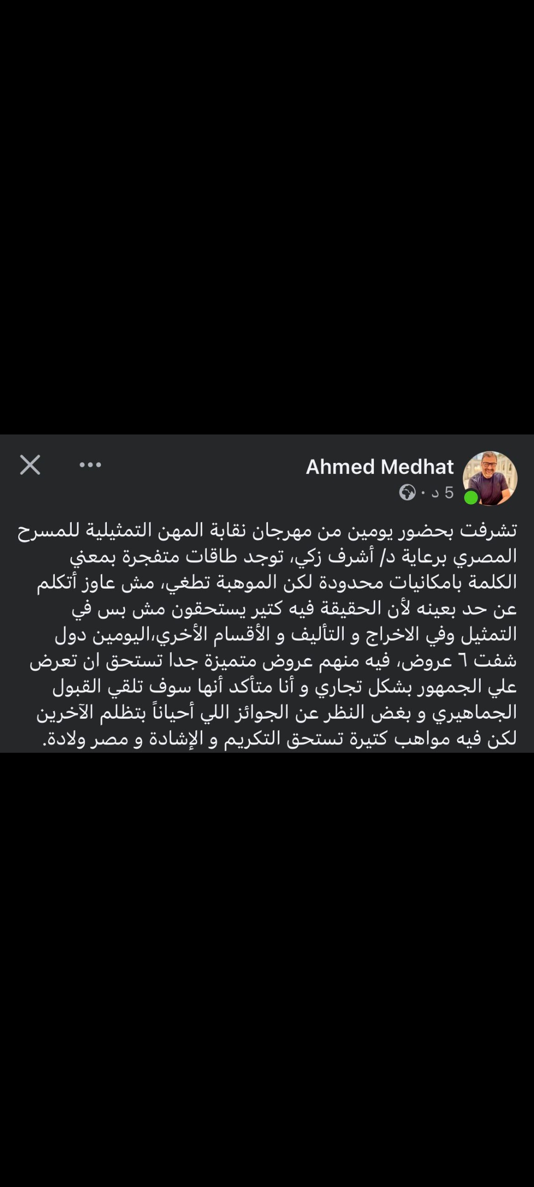 وقال احمد مدحت عبر رسالة قصيرة علي موقع التواصل الاجتماعي فيسبوك : "تشرفت بحضور يومين من مهرجان نقابة المهن التمثيلية للمسرح المصري برعاية الدكتور أشرف زكي، توجد طاقات متفجرة بمعني الكلمة بإمكانيات محدودة لكن الموهبة تطغي".