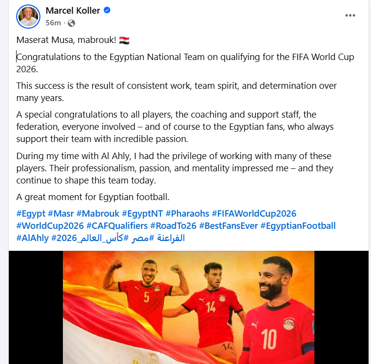 وجه مارسيل كولر، المدير الفني السابق للنادي الأهلي، رسالة تهنئة خاصة إلى منتخب مصر بعد تأهله رسميًا إلى نهائيات كأس العالم 2026، مؤكدًا أن هذا الإنجاز يعكس العمل الجماعي والروح القتالية للاعبين على مدار سنوات.