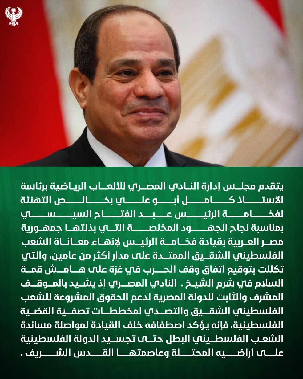 يتقدم مجلس إدارة النادي المصري للألعاب الرياضية برئاسة كامل أبو علي بخالص التهنئة للسيد الرئيس عبد الفتاح السيسي، بمناسبة نجاح الجهود المخلصة التي بذلتها جمهورية مصر العربية بقيادة الرئيس لإنهاء معاناة الشعب الفلسطيني الشقيق الممتدة على مدار أكثر من عامين، والتي تكللت بتوقيع اتفاق وقف الحرب في غزة على هامش قمة السلام في شرم الشيخ.