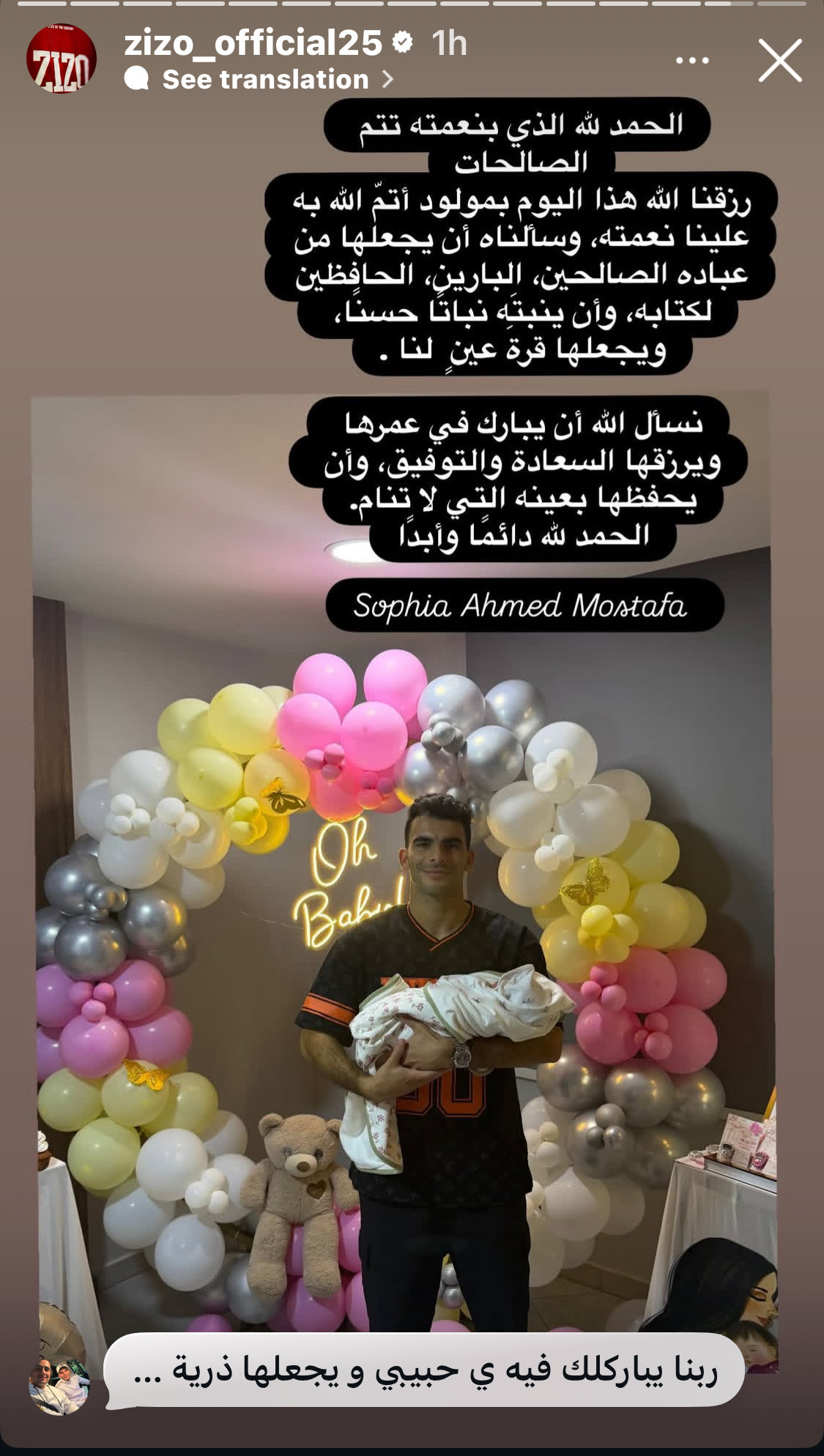 وكتب زيزو في منشوره: "الحمدلله الذي بنعمته تتم الصالحات، رزقنا الله هذا اليوم بمولود أتم الله به علينا نعمته، وسألناه أن يجعلها من عباده الصالحين، البارين، الحافظين لكتابه، وأن يُنبتها نباتًا حسنًا، ويجعلها قُرّة عين لنا".