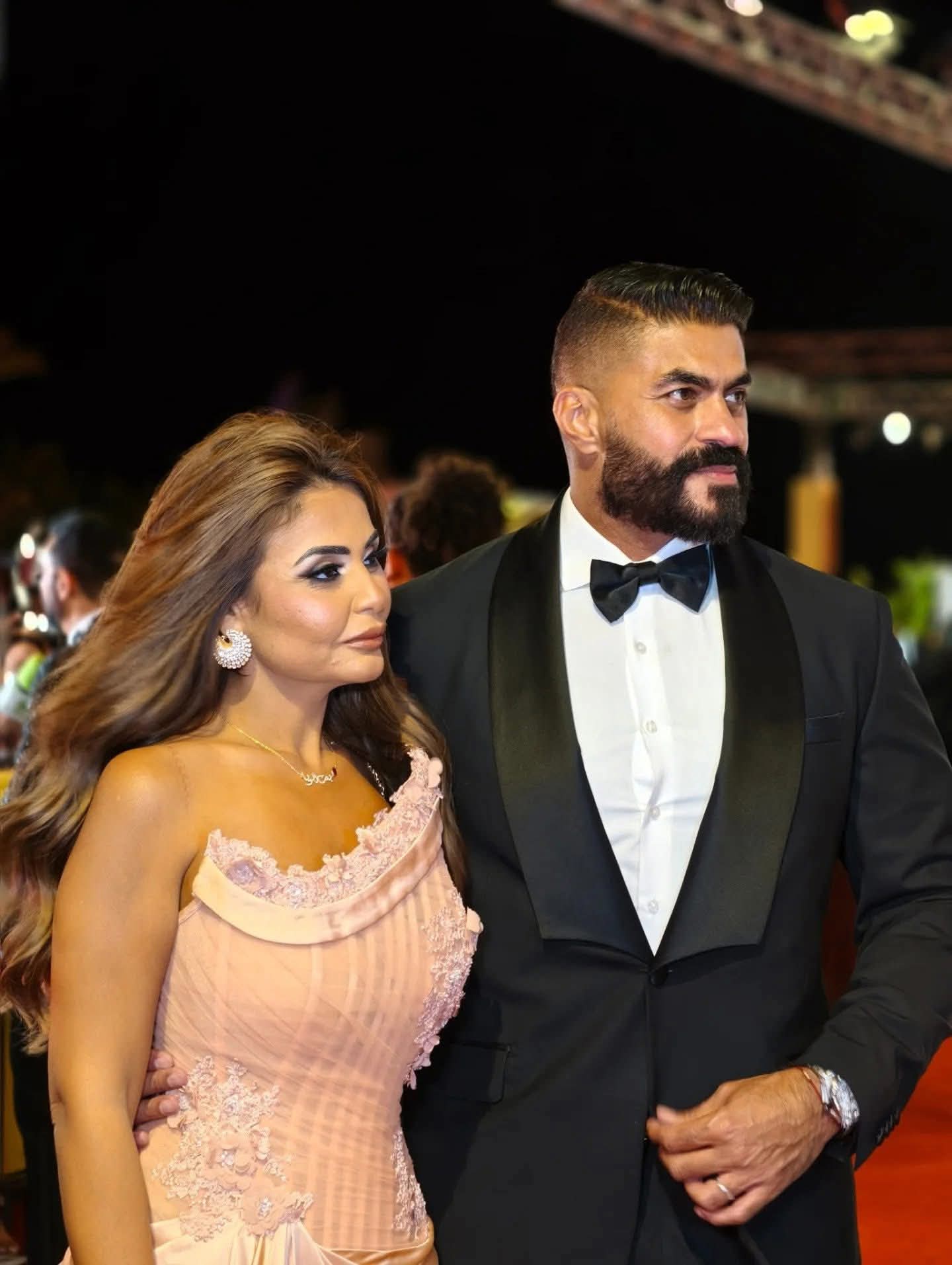 ومن أكثر الإطلالات التي لفتت الأنظار أيضًا، ظهور الفنان هاني رمزي وزوجته، حيث اختار بدلة سوداء تقليدية، فيما تألقت زوجته بفستان أحمر ناري بفتحة ساق جريئة أثارت إعجاب الحضور وعدسات المصورين.