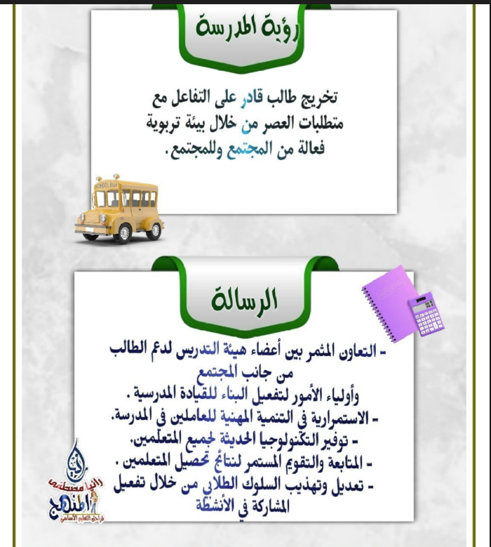 ويُمكن الاطلاع على رؤية المدرسة، والرسالة، ورؤية 2030، والأهداف العامة للتعليم الأساسي، والأهداف العامة لتدريس مادة التوكاتسو، من خلال الصور التالية: