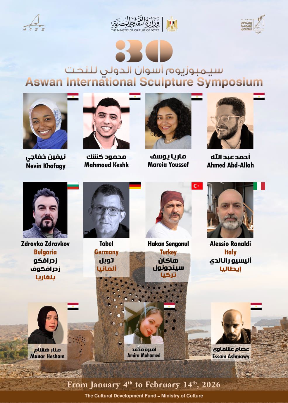 أعلنت اللجنة العليا لسيمبوزيوم اسوان الدولي للنحت، عن المشاركين في الدورة الثلاثين للسيمبوزيوم، والذي يقيمه قطاع صندوق التنمية الثقافية بوزارة الثقافة المصرية، والتي تقام خلال الفترة من ٤ يناير حتى ١٤ فبراير ٢٠٢٦ بمحافظة أسوان.