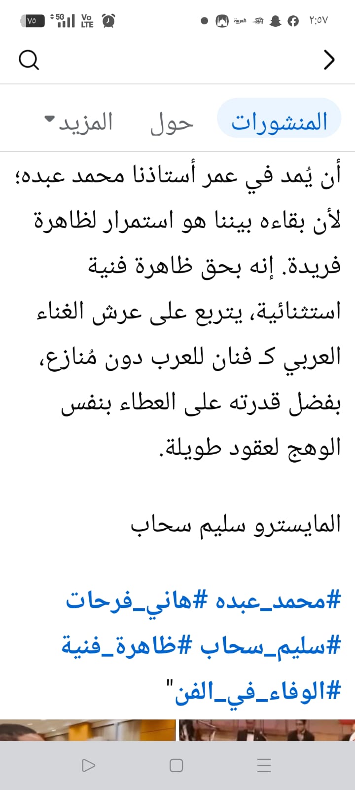 ونشر المايسترو سليم سحاب عدد 2 فيديو أحدهما موقف المايسترو هاني فرحات والآخر موقف يخصه مع الفنانة القديرة الراحلة سعاد محمد وعلق : كان هذا أبلغ رد وتبادل إحترام ومحبه للعظيم فنان العرب محمد عبده "في قاموس الفن الأصيل لا تقاس القامات بالنجومية العابرة بل بالبصمة الخالدة والتقدير الذي تورثه الأجيال.