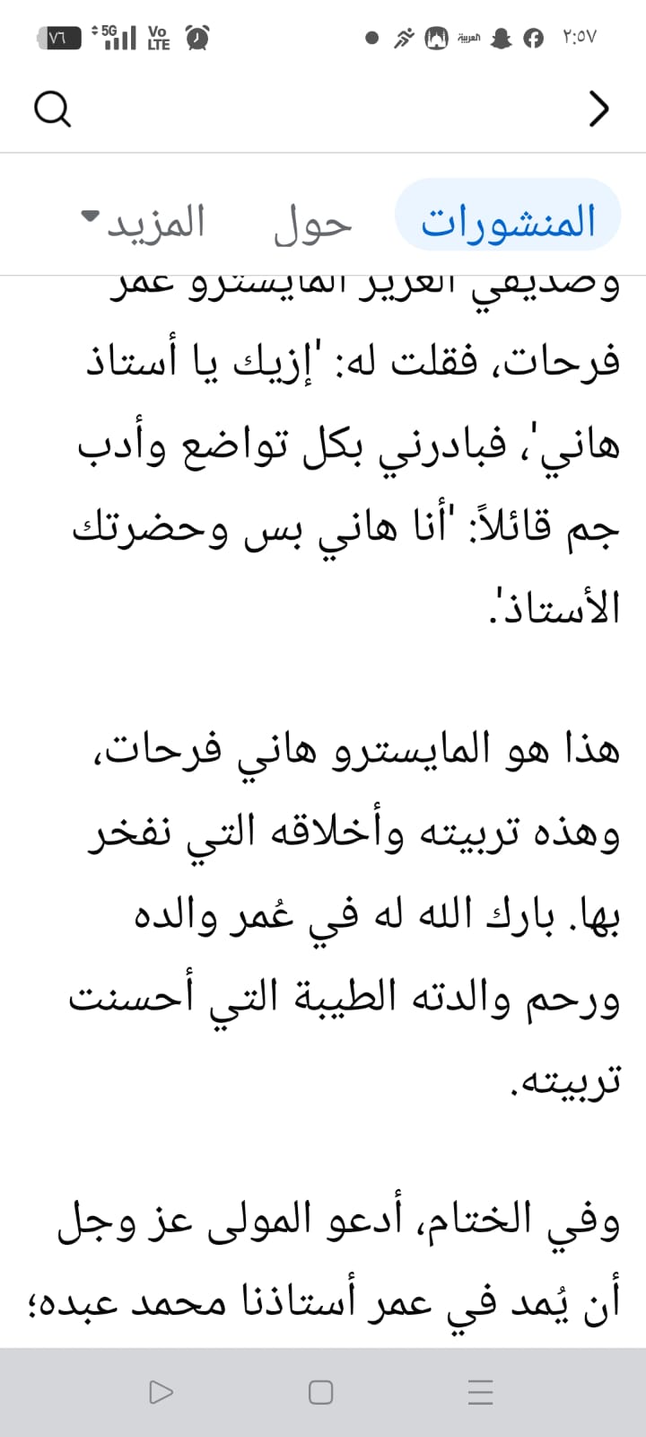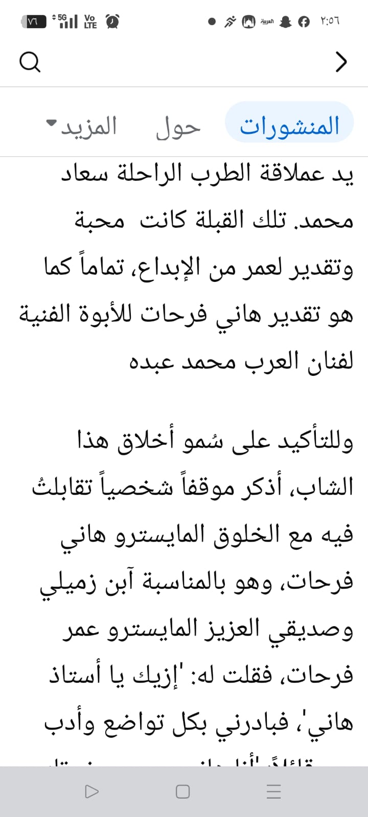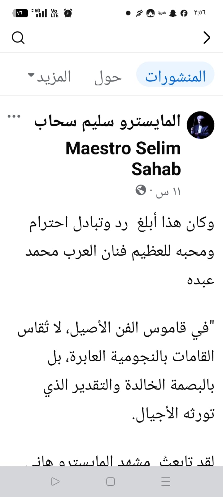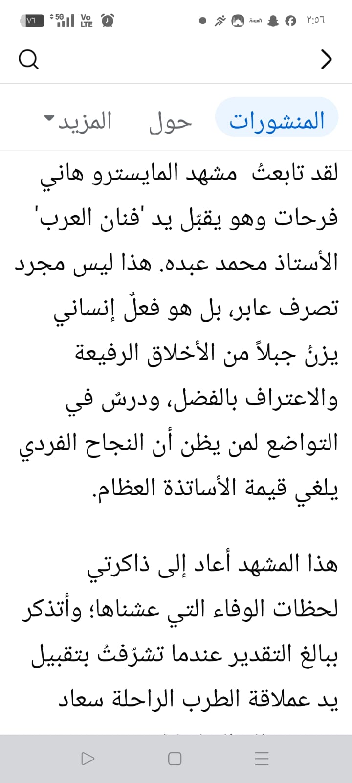 وأكد المايسترو سليم سحاب لقد تابعت مشهد المايسترو هاني فرحات وهو يقبل يد فنان العرب الأستاذ محمد عبده هذا ليس مجرد تصرف عابر بل هو فعل إنساني يزن جبلا من الأخلاق الرفيعة والإعتراف بالفضل، ودرس في التواضع لمن يظن أن النجاح الفردي يلغي قيمة الأساتذة العظام.