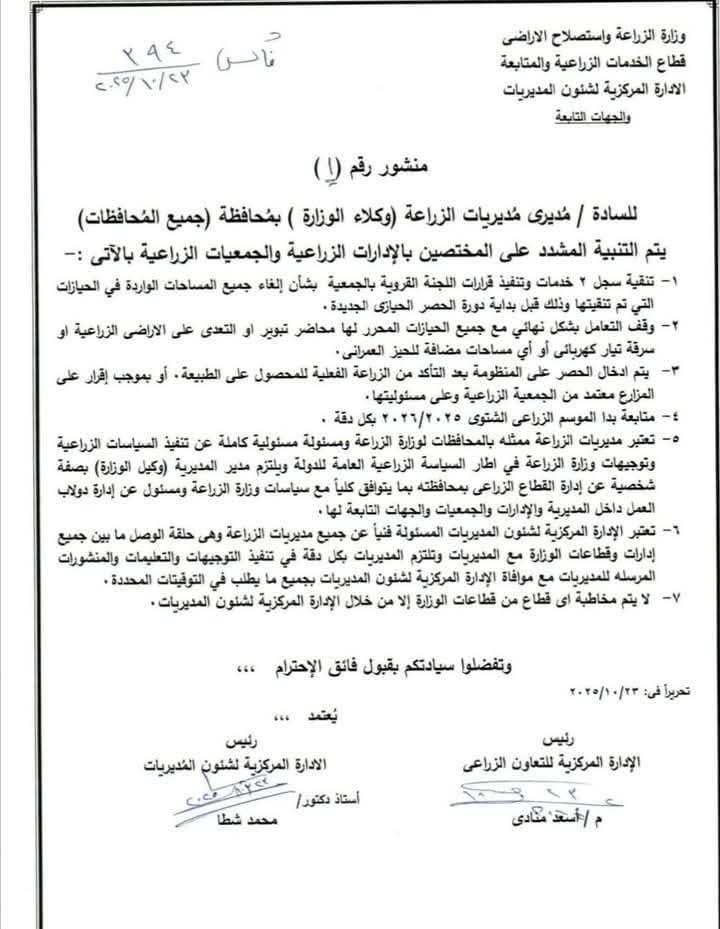 وشددت الوزارة على أن مديريات الزراعة بالمحافظات تُعد الممثل الرسمي للوزارة ومسؤولة مسؤولية كاملة عن تنفيذ السياسات الزراعية والتوجيهات الوزارية، مشيرة إلى أن مدير المديرية (وكيل الوزارة) يتحمل المسؤولية الشخصية المباشرة عن إدارة القطاع الزراعي في محافظته وضمان انضباط العمل داخل المديريات والإدارات والجمعيات الزراعية التابعة.