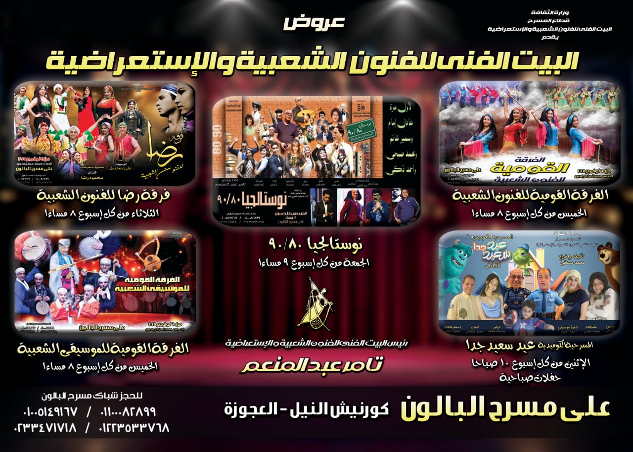 بينما تقدم فرقة رضا للفنون الشعبية فقراتها يوم الثلاثاء من كل أسبوع بينما يعرض مسرح البالون مسرحية الأطفال عيد سعيد جدا كل اثنين صباحا للنجمين رضا ادريس وحسن عبد الفتاح