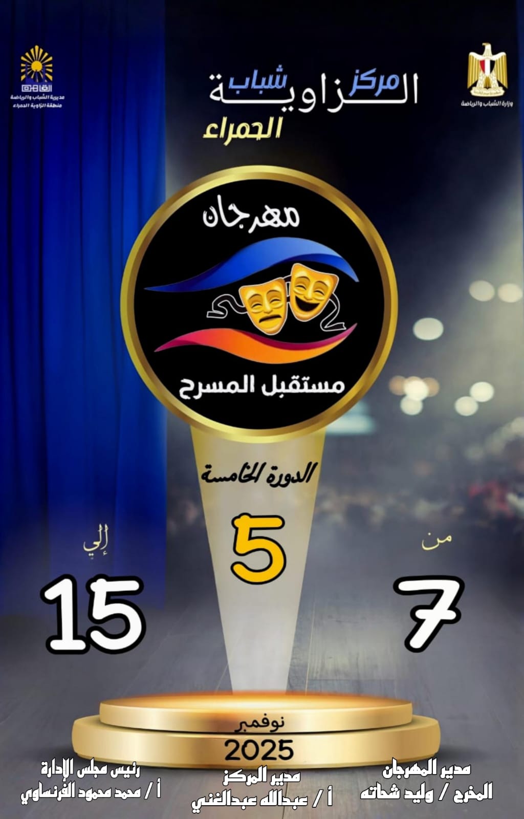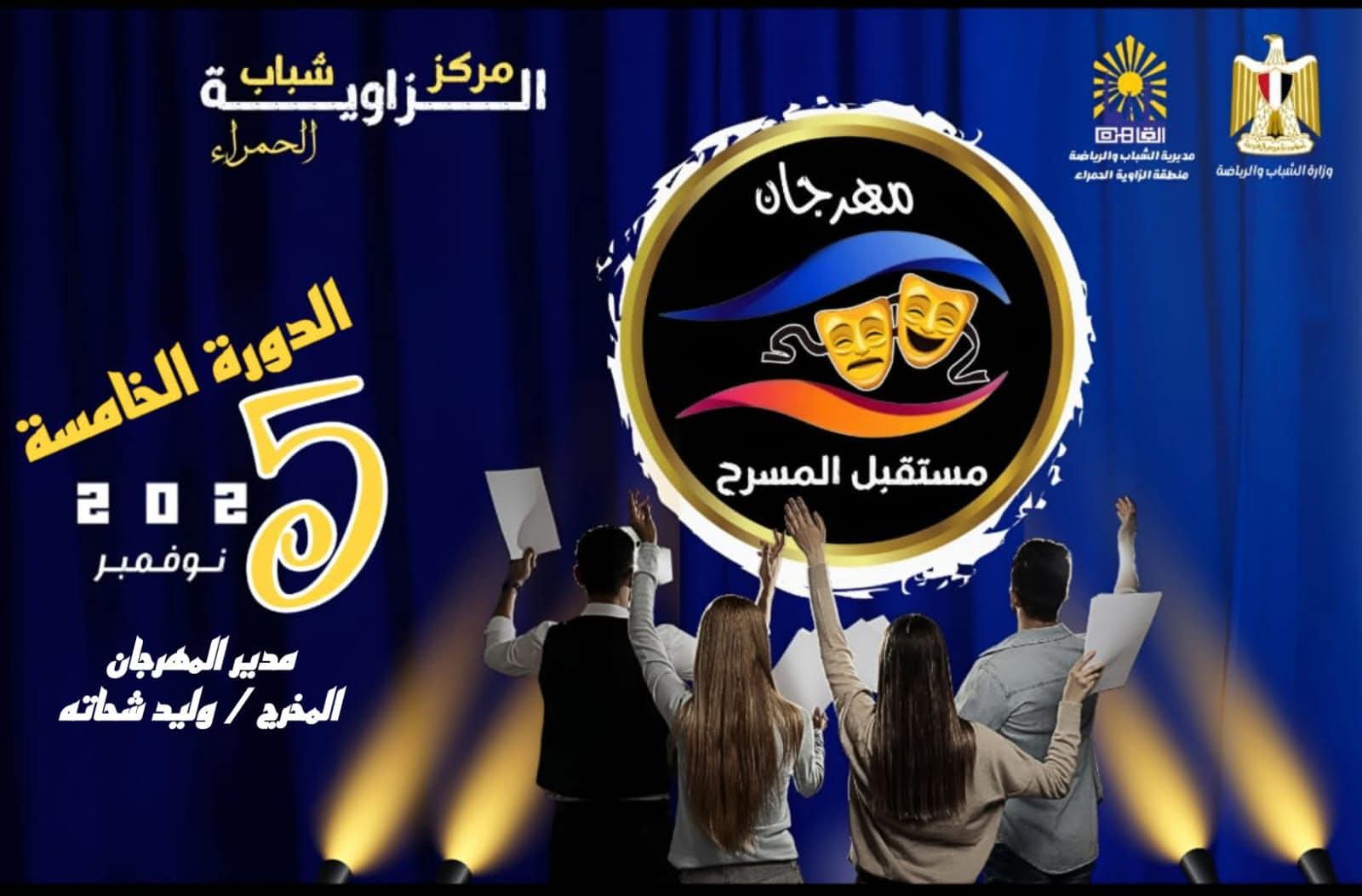 ويقدم برنامج مهرجان «مستقبل المسرح» بمركز شباب الزاوية الحمراء سلسلة من العروض المتنوعة التي تقدمها فرق شبابية من مختلف المحافظات، حيث يُفتتح المهرجان يوم السبت 8 نوفمبر بعرض «أفراح القبة» لفرقة (Rubik’s) من القاهرة تأليف نجيب محفوظ وإخراج أحمد محمود، وعرض «المرآة» لفرقة فنانين بالصدفة» من الدقهلية تأليف رضا عواد وإخراج محمد سمير.