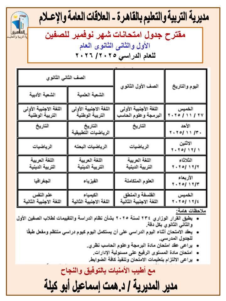 أعلنت مديرية التربية والتعليم بالقاهرة، برعاية الدكتورة همت إسماعيل أبو كيلة، عن مقترح جداول امتحانات شهر نوفمبر لمراحل النقل الثلاثة (الابتدائي – الإعدادي – الثانوي) للعام الدراسي 2025 / 2026.