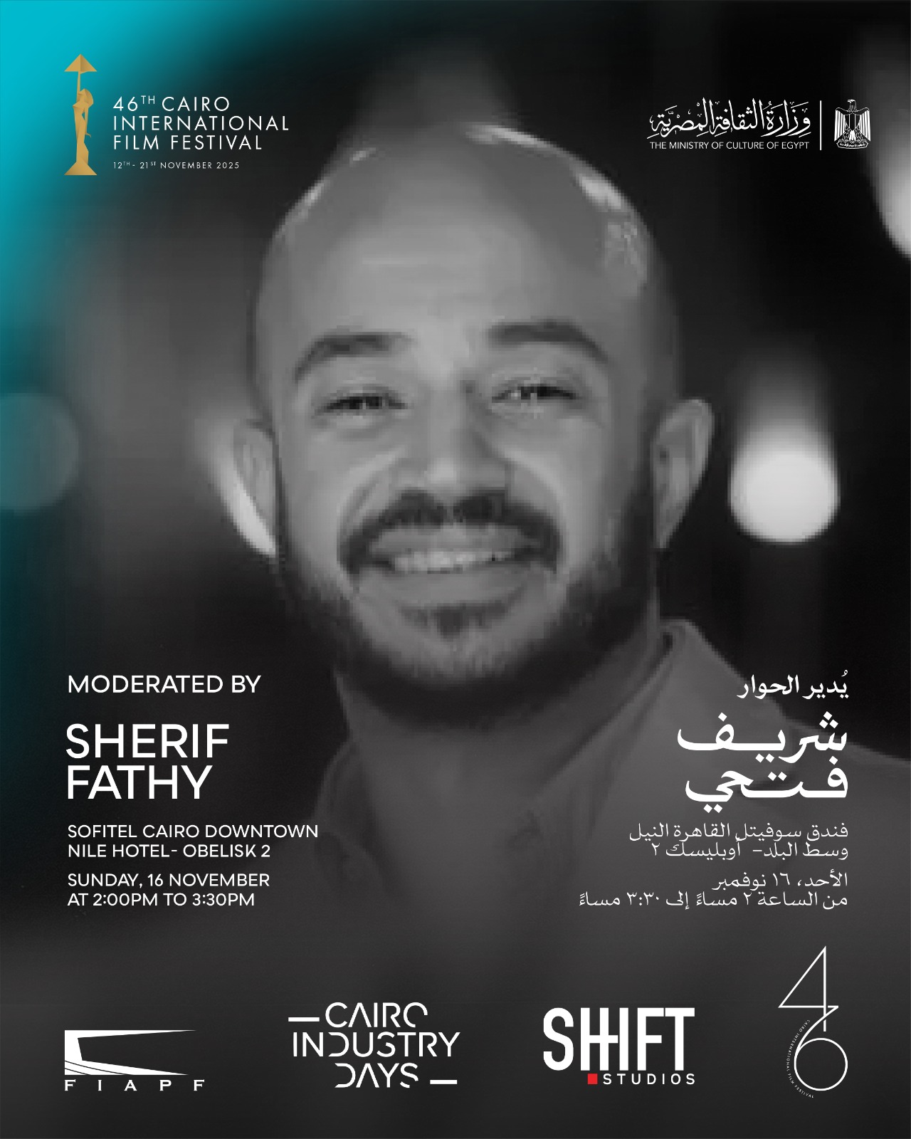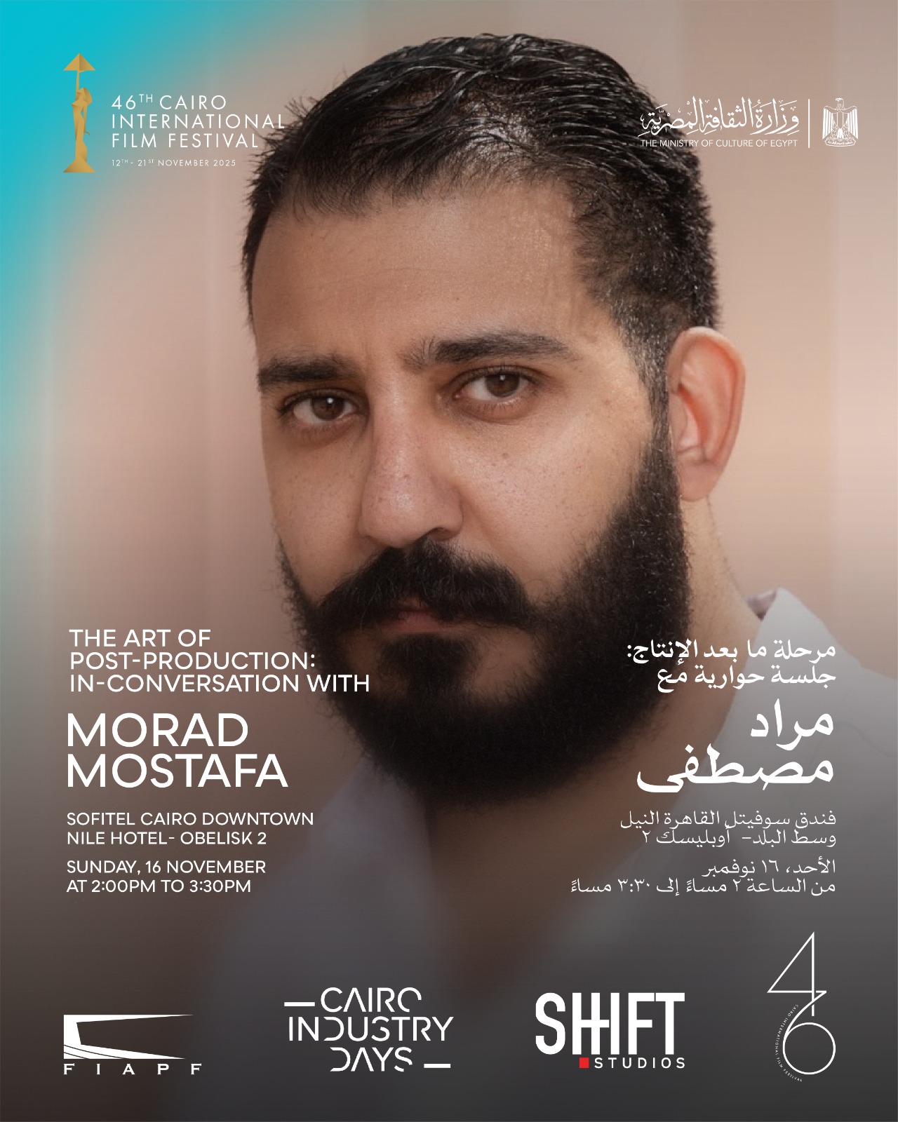 في إطار فعاليات أيام القاهرة لصناعة السينما، المقامة ضمن الدورة الـ46 من مهرجان القاهرة السينمائي الدولي، يستضيف فندق سوفتيل – قاعة أوبليسك 2 اليوم الأحد 16 نوفمبر جلسة نقاشية بعنوان "مرحلة ما بعد الإنتاج مع مراد مصطفى وشريف فتحي – بدعم من استوديوهات شيفت"، وذلك في تمام الساعة 3:00 حتى 4:30 مساءً، وبحضور مخصص لحاملي البطاقات.