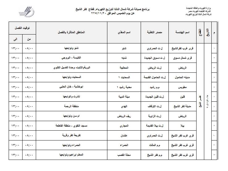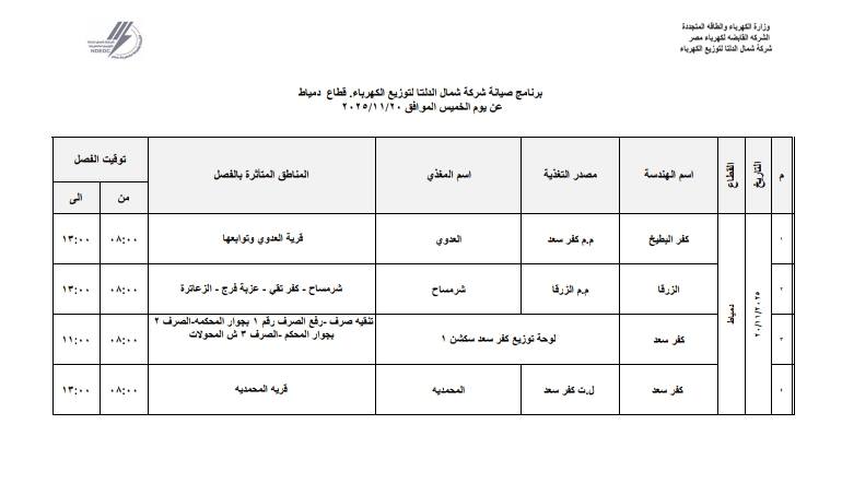 أعلنت شركة شمال الدلتا لتوزيع الكهرباء، عن انقطاع التيار الكهربائي اليوم الخميس الموافق 20 نوفمبر 2025، عن عدة مناطق في 3 محافظات دمياط، الدقهلية، كفر الشيخ.