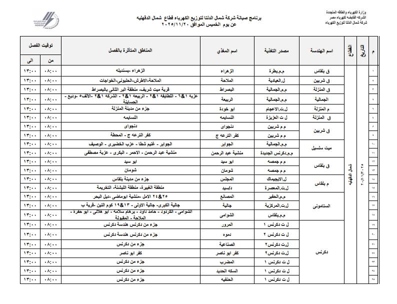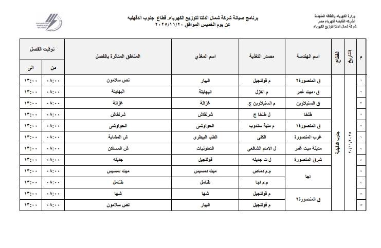 وبحسب بيان الشركة، يشمل برنامج الفصل مناطق تابعة لهندسات: المنصورة، ميت غمر، السنبلاوين، طلخا، غرب المنصورة ، ميت غمر، شرق المنصورة، أجا.