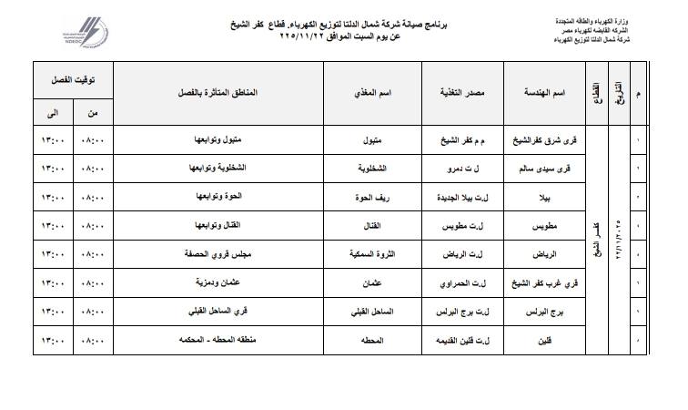 واستكمل البيان الصادر عن كهرباء كفر الشيخ، أنه في مركز مطوبس سيتم قطع الكهرباء عن القنال وتوابعها، وفي مركز بيلا عن قرية الحوة وتوابعها، وفي مركز الرياض عن مجلس قروي الحصفة وتوابعها.