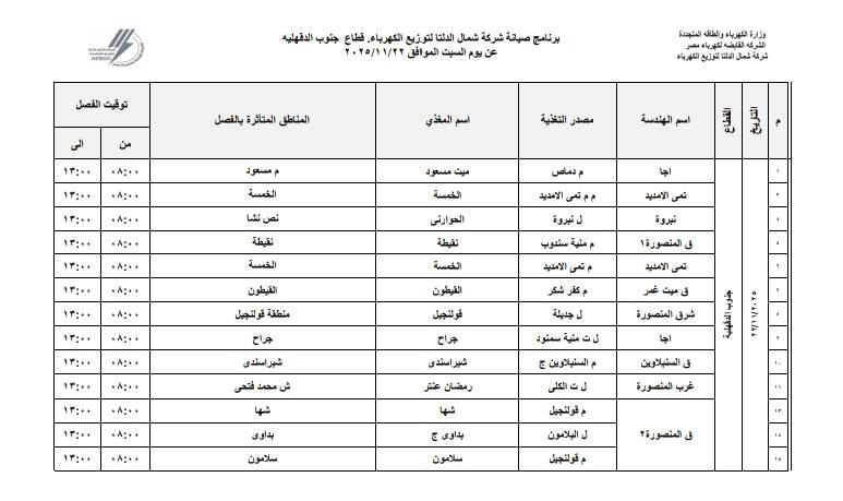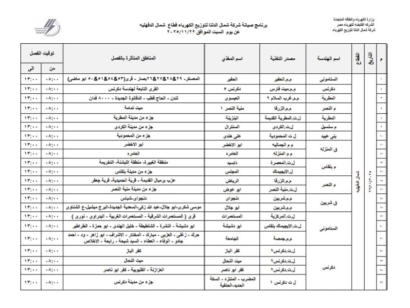 أعلنت شركة شمال الدلتا لتوزيع الكهرباء عن انقطاع التيار الكهربائي اليوم السبت الموافق 22 نوفمبر 2025 عن عدة مناطق في 3 محافظات دمياط، الدقهلية، كفر الشيخ.