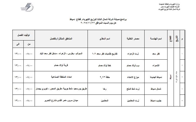 وأعلنت شركة شمال الدلتا لتوزيع الكهرباء عن برنامج أعمال الصيانة المجدولة التي ستستلزم فصل التيار الكهربائي عن عدد من المناطق التابعة للمحافظات الثلاث دمياط- الدقهلية- كفر الشيخ.