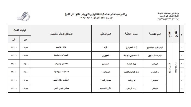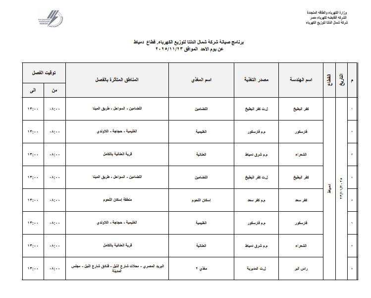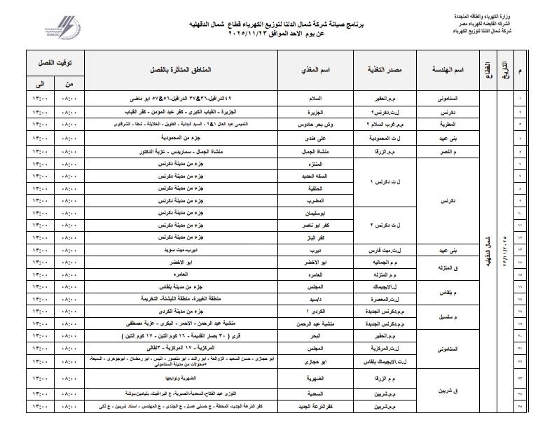 وأعلنت شركة شمال الدلتا لتوزيع الكهرباء عن برنامج أعمال الصيانة المجدولة التي ستستلزم فصل التيار الكهربائي عن عدد من المناطق التابعة للمحافظات الثلاث دمياط- الدقهلية- كفر الشيخ.