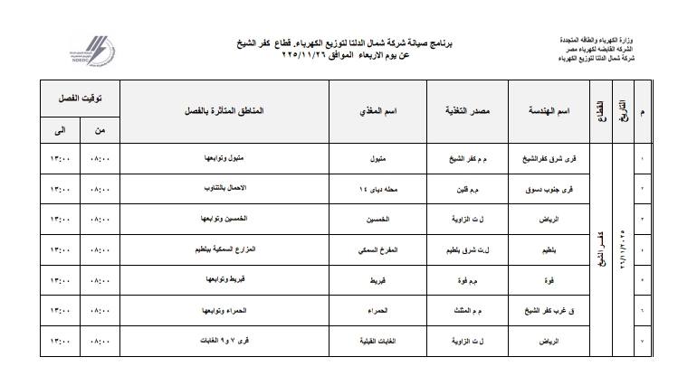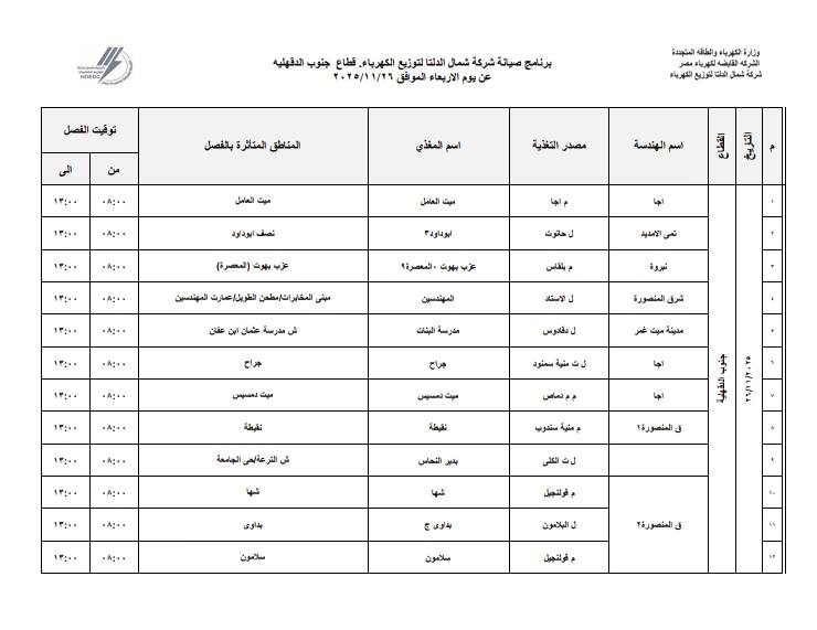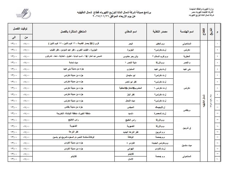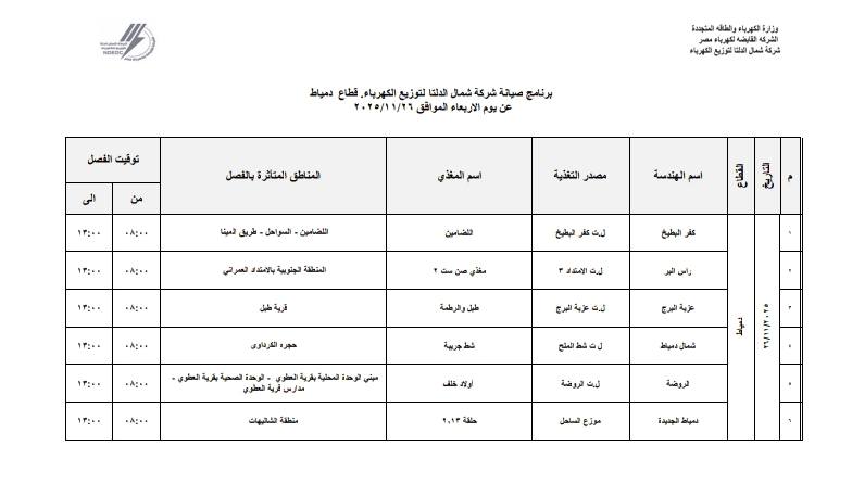 أعلنت شركة شمال الدلتا لتوزيع الكهرباء عن انقطاع التيار الكهربائي اليوم الأربعاء الموافق 26 نوفمبر 2025 عن عدة مناطق في 3 محافظات وهي:- دمياط، الدقهلية، كفر الشيخ.