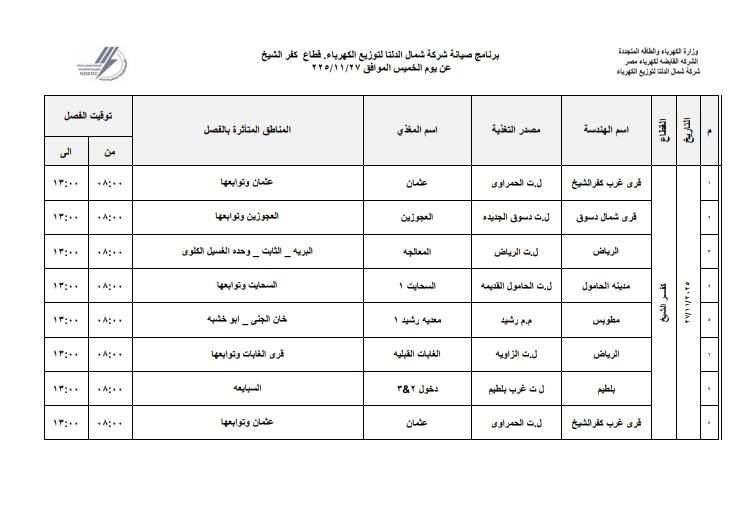 وأكدت هندسة كهرباء كفر الشيخ، أن المناطق المستهدفة هي، قرية عثمان وتوابعها بمركز كفر الشيخ، وفي مركز دسوق عن قرية العجوزين وتوابعها، وفي مركز الرياض، عن قرية البرية، وقرية الثابت، ومنطقة وحدة غسيل الكلي، وفي مركز الحامول عن قرية الساحيت وتوابعها.