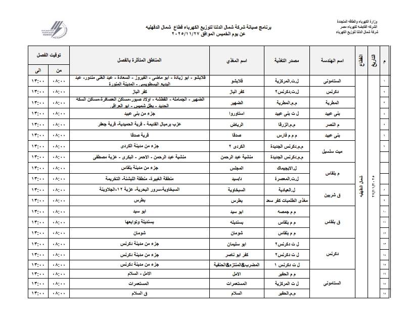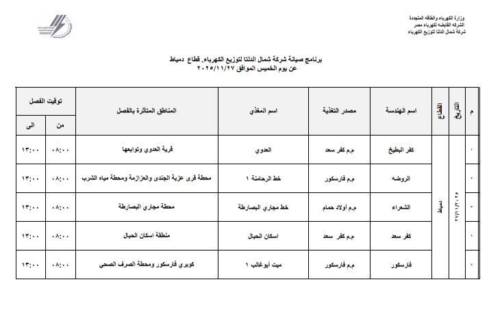 أعلنت شركة شمال الدلتا لتوزيع الكهرباء عن انقطاع التيار الكهربائي اليوم الخميس الموافق 27 نوفمبر 2025 عن عدة مناطق في 3 محافظات وهي:- دمياط، الدقهلية، كفر الشيخ.