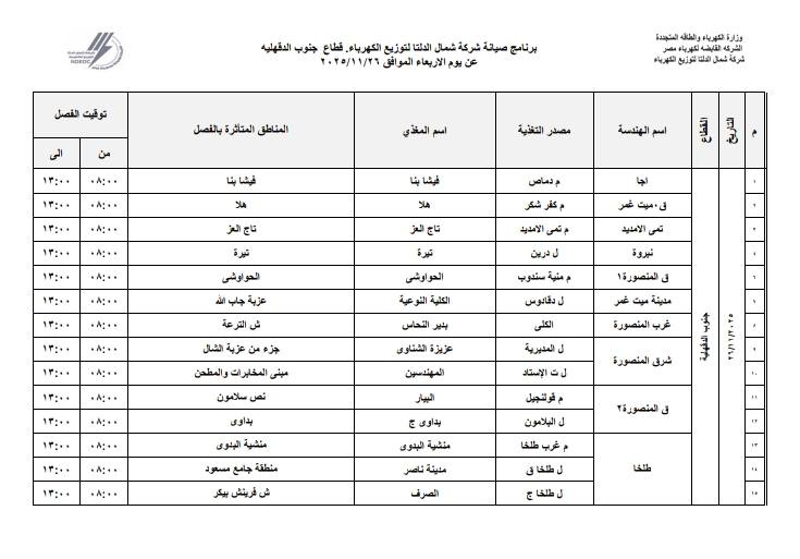 وأعلنت شركة شمال الدلتا لتوزيع الكهرباء عن برنامج أعمال الصيانة المجدولة التي ستستلزم فصل التيار الكهربائي عن عدد من المناطق التابعة للمحافظات الثلاث دمياط، الدقهلية، كفر الشيخ.