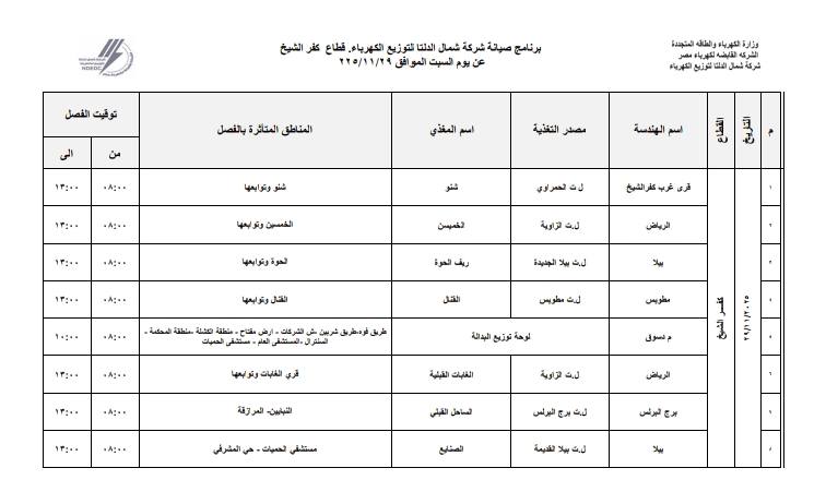 أعلنت شركة شمال الدلتا لتوزيع الكهرباء عن انقطاع التيار الكهربائي اليوم السبت الموافق 29 نوفمبر 2025 عن عدة مناطق في 3 محافظات وهي:- دمياط، الدقهلية، كفر الشيخ.
