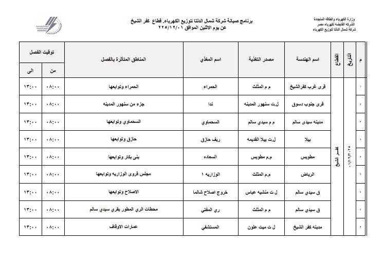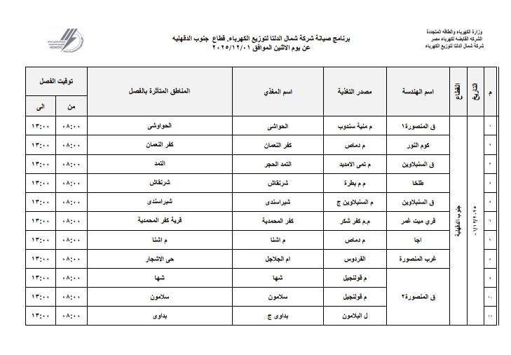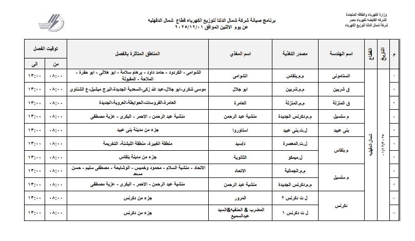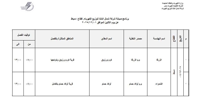 أعلنت شركة شمال الدلتا لتوزيع الكهرباء عن انقطاع التيار الكهربائي اليوم الاثنين الموافق 1 ديسمبر 2025 عن عدة مناطق في 3 محافظات وهي:- دمياط، الدقهلية، كفر الشيخ.