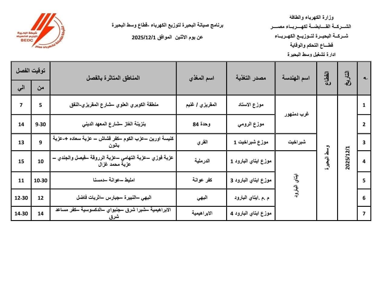 كما أعلنت الوحدة المحلية لمركز ومدينة المحمودية، برئاسة اللواء وائل حمزة، رئيس الوحدة المحلية، ورود إشارة للوحدة المحلية من هندسة كهرباء المحمودية برئاسة المهندس عماد أبو عسل، مدير الهندسة، بفصل التيار الكهربائي عن عدة مناطق بمركز المحمودية صباح اليوم الإثنين الموافق الأول من شهر ديسمبر 2025.
