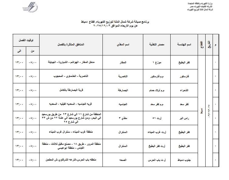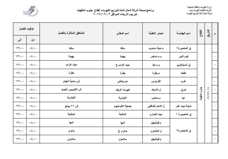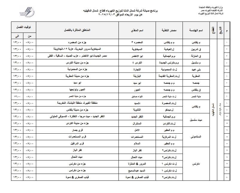 أعلنت شركة شمال الدلتا لتوزيع الكهرباء عن انقطاع التيار الكهربائي اليوم الأربعاء الموافق 3 ديسمبر 2025 عن عدة مناطق في 3 محافظات وهي:- دمياط، الدقهلية، كفر الشيخ.