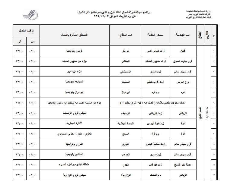 واستكمل بيان هندسة كهرباء كفر الشيخ، بأنه في برج البرلس عن قرية السبايعة، وفي بلطيم عن جزء من المدينة الصناعية ببلطيم، وقرية أبو سكين وتوابعها، وفي الرياض عن قرية الرصيف وتوابعها.