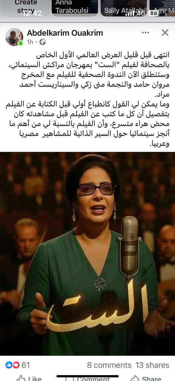 أشاد الناقد السينمائي المغربي عبد الكريم واكريم، رئيس تحرير مجلة سنفيليا السينمائية المتخصصة، بفيلم الست بطولة النجمة مني زكي، عقب عرضه الخاص للصحفيين الذي أقيم فى المهرجان الدولي للفيلم بمراكش، في دورته الـ 22، وذلك قبل عرضه العالمي الأول للجمهور مساء اليوم.