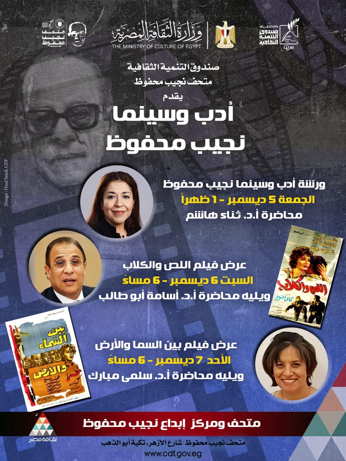 في إطار احتفال مركز ومتحف نجيب محفوظ، الكائن بتكية محمد أبو الدهب التابعة للصندوق بجوار الجامع الأزهر، بالذكرى الـ 114 لميلاد صاحب "الثلاثية"، يُطلق المتحف على مدار ثلاثة أيام ورشة "سينما وأدب نجيب محفوظ".
