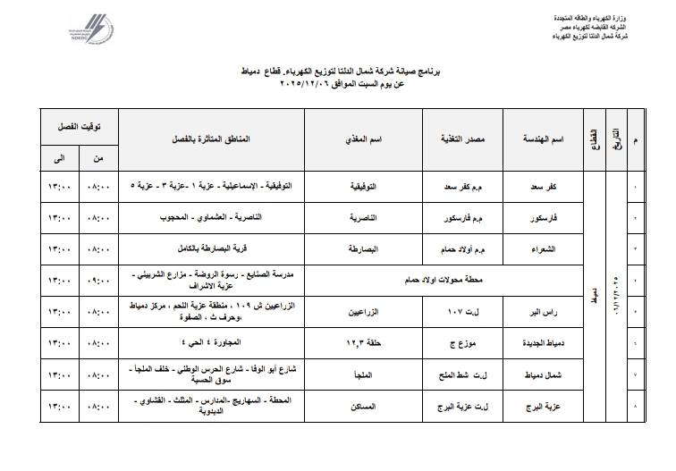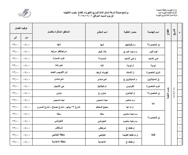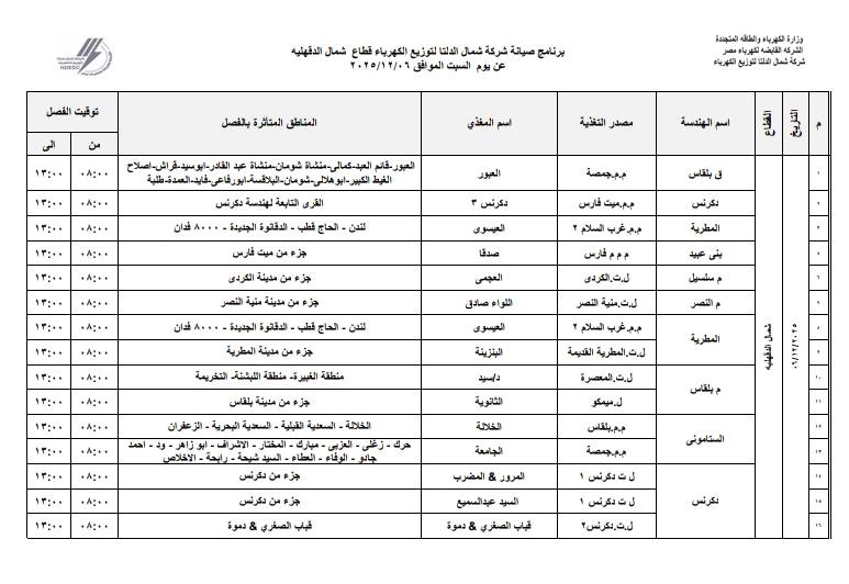 أعلنت شركة شمال الدلتا لتوزيع الكهرباء عن انقطاع التيار الكهربائي اليوم السبت الموافق 6 ديسمبر 2025 عن عدة مناطق في 3 محافظات وهي:- دمياط، الدقهلية، كفر الشيخ.