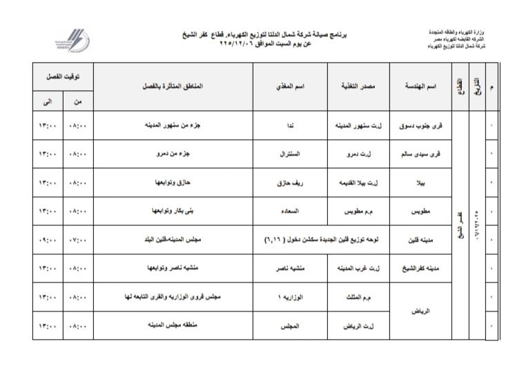 جدول فصل الكهرباء في دمياط والدقهلية وكفر الشيخ اليوم السبت 6 ديسمبر