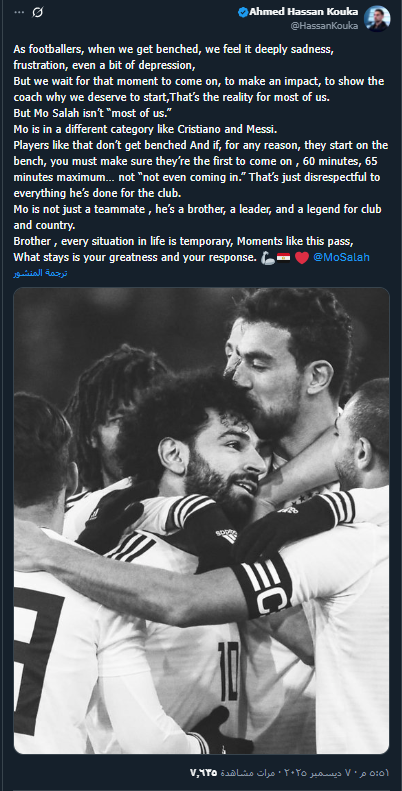 كما شارك التوأم حسن رسالة دعم لصلاح عبر حساباتهما الرسمية على موقع إنستجرام، جاء فيها: "دائماً رمز للإصرار والقوة"، مصحوبة بصورة للفرعون المصري برفقة حسام حسن، في إشارة واضحة إلى وقوف الجهاز الفني خلف اللاعب خلال هذه الفترة الحرجة.