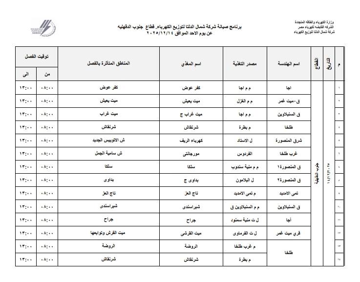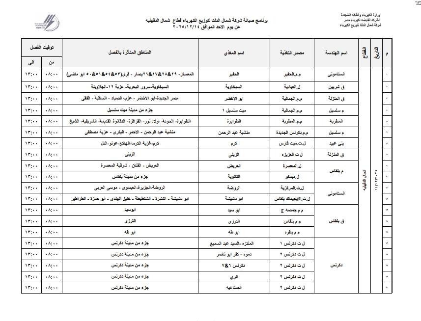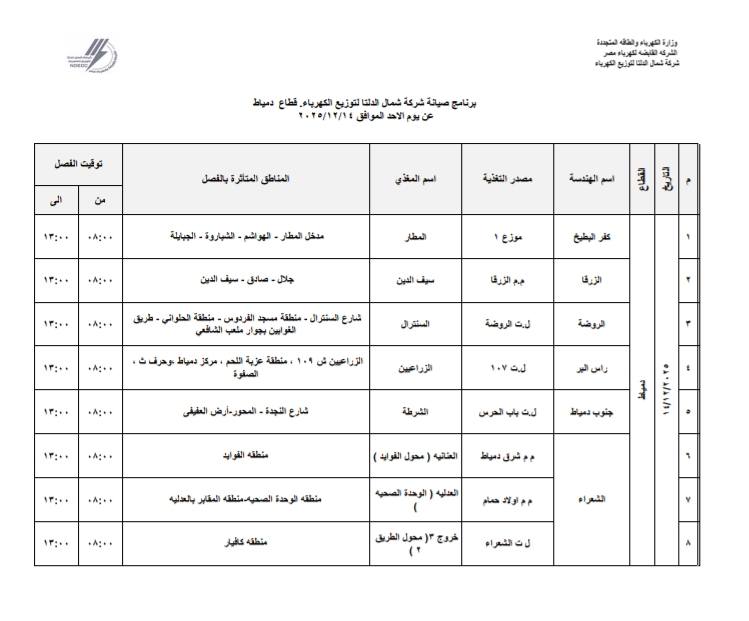 أعلنت شركة شمال الدلتا لتوزيع الكهرباء عن انقطاع التيار الكهربائي اليوم الأحد الموافق 14 ديسمبر 2025 عن عدة مناطق في 3 محافظات وهي:- دمياط، الدقهلية، كفر الشيخ.