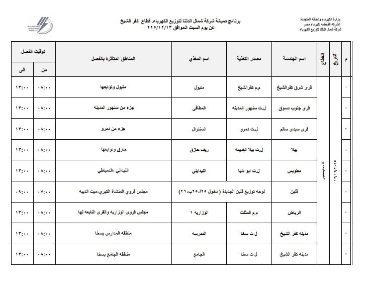 وأعلنت شركة شمال الدلتا لتوزيع الكهرباء عن برنامج أعمال الصيانة المجدولة التي ستستلزم فصل التيار الكهربائي عن عدد من المناطق التابعة للمحافظات الثلاث دمياط، الدقهلية، كفر الشيخ.