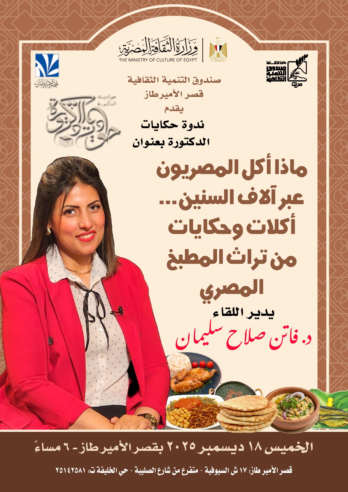 يقيم مركز إبداع قصر الأمير طاز بالخليفة، التابع لقطاع صندوق التنمية الثقافية برئاسة المعمارى حمدى السطوحى، ندوة جديدة من سلسلة ندوات (حكايات الدكتورة) بعنوان "ماذا أكل المصريون عبر آلاف السنين.. أكلات وحكايات من تراث المطبخ المصرى" فى الساعة السادسة مساء الخميس (١٨ ديسمبر).