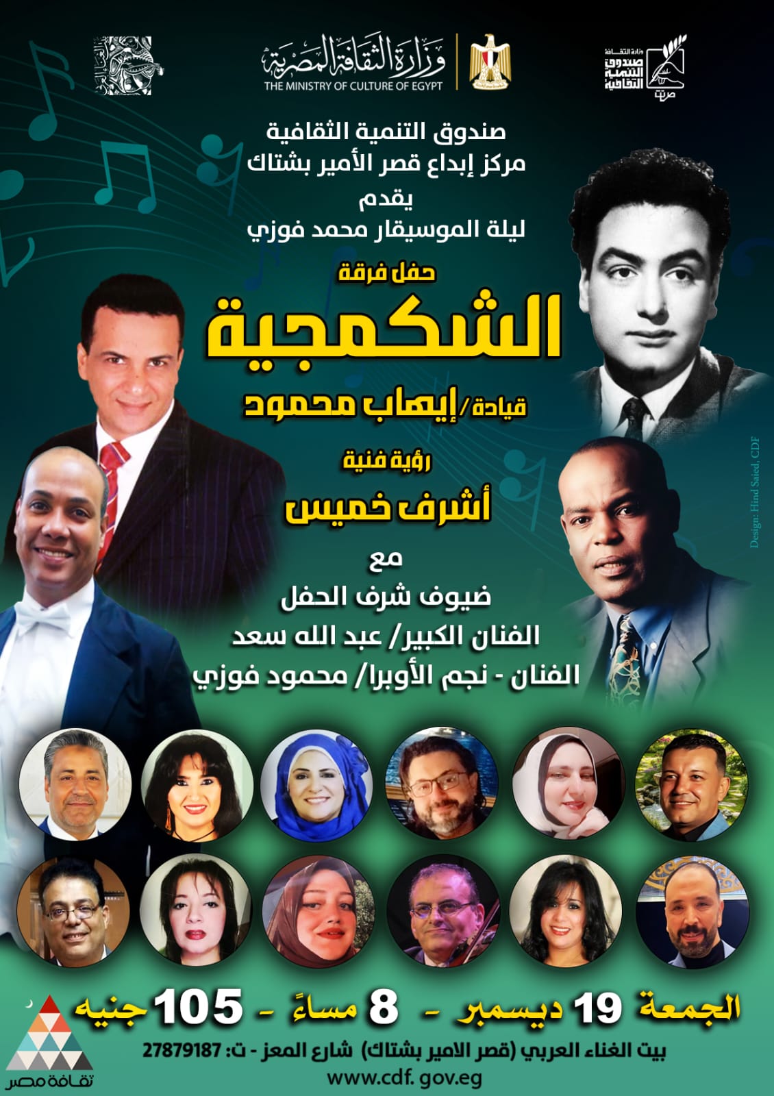 ينظم مركز إبداع قصر الأمير بشتاك بشارع المعز -التابع لصندوق التنمية الثقافية- حفلا غنائيا جديداً لفرقة (الشكمجية) بعنوان ليلة الموسيقار محمد فوزي، وذلك غداً (الجمعة 19 ديسمبر)، الساعة الثامنة مساء، الحفل قيادة الفنان إيهاب محمود ورؤية فنية أشرف خميس.
