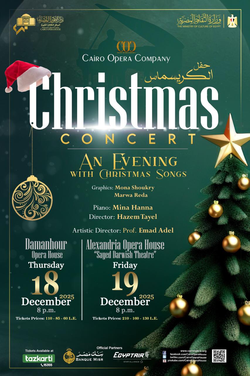 تواصل دار الأوبرا المصرية، برئاسة الدكتور علاء عبد السلام، احتفالاتها بالكريسماس والعام الجديد، حيث تُقيم حفلين لفرقة أوبرا القاهرة، تحت إشراف مديرها الفني عماد عادل، وبمصاحبة عازف البيانو مينا حنا، ومن إخراج حازم طايل، وذلك في تمام الساعة الثامنة مساء يوم الخميس 18 ديسمبر على مسرح أوبرا دمنهور، ويوم الجمعة 19 ديسمبر على مسرح سيد درويش «أوبرا الإسكندرية».