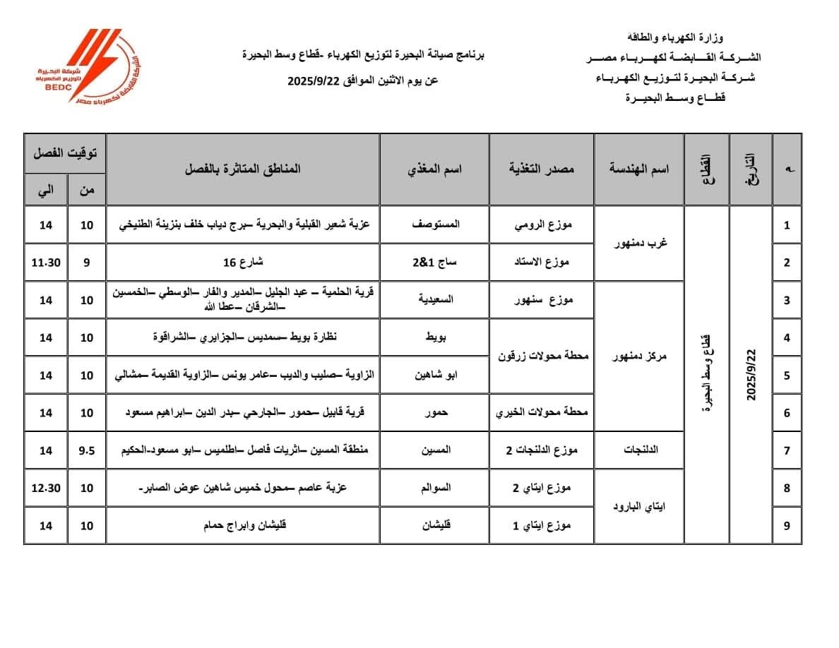 حيث من المقرر فصل التيار الكهربائي عن مركز دمنهور، بمناطق عزبة شعير القبلية والبحرية، برج دياب خلف بنزينة الطينخي، وذلك من الساعة العاشرة صباحاً وحتى الساعة الثانية ظهراً، شارع 16، وذلك من الساعة التاسعة صباحاً وحتى الساعة الحادية عشر صباحاً.