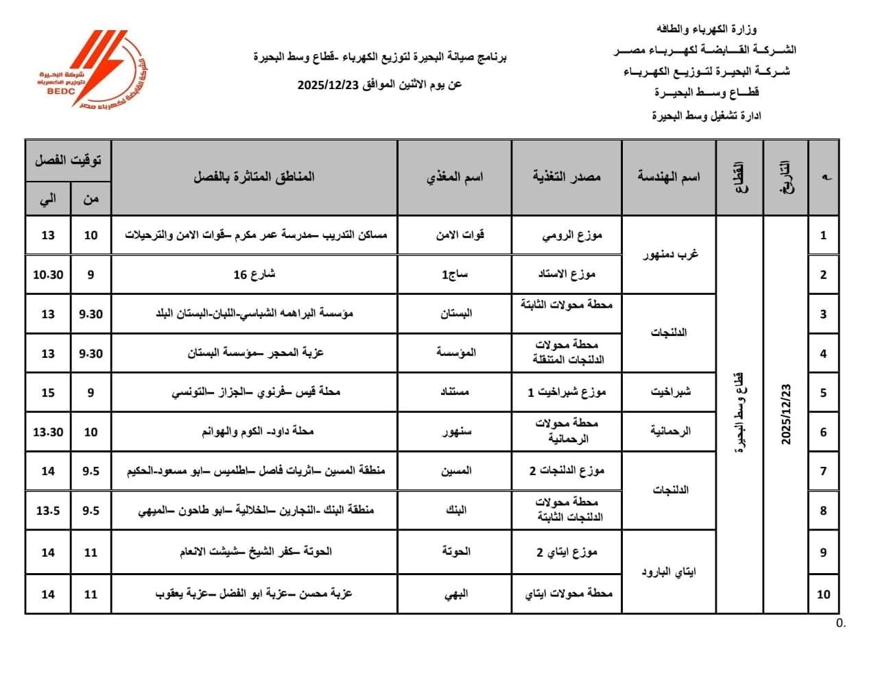 أعلنت شركة البحيرة لتوزيع الكهرباء، قطاع وسط البحيرة، فصل التيار الكهربائي صباح اليوم الثلاثاء الموافق 23 ديسمبر، عن عدة قري ومناطق بمراكز دمنهور وإيتاي البارود وشبراخيت والدلنجات والرحمانية، لإجراء أعمال الصيانة.