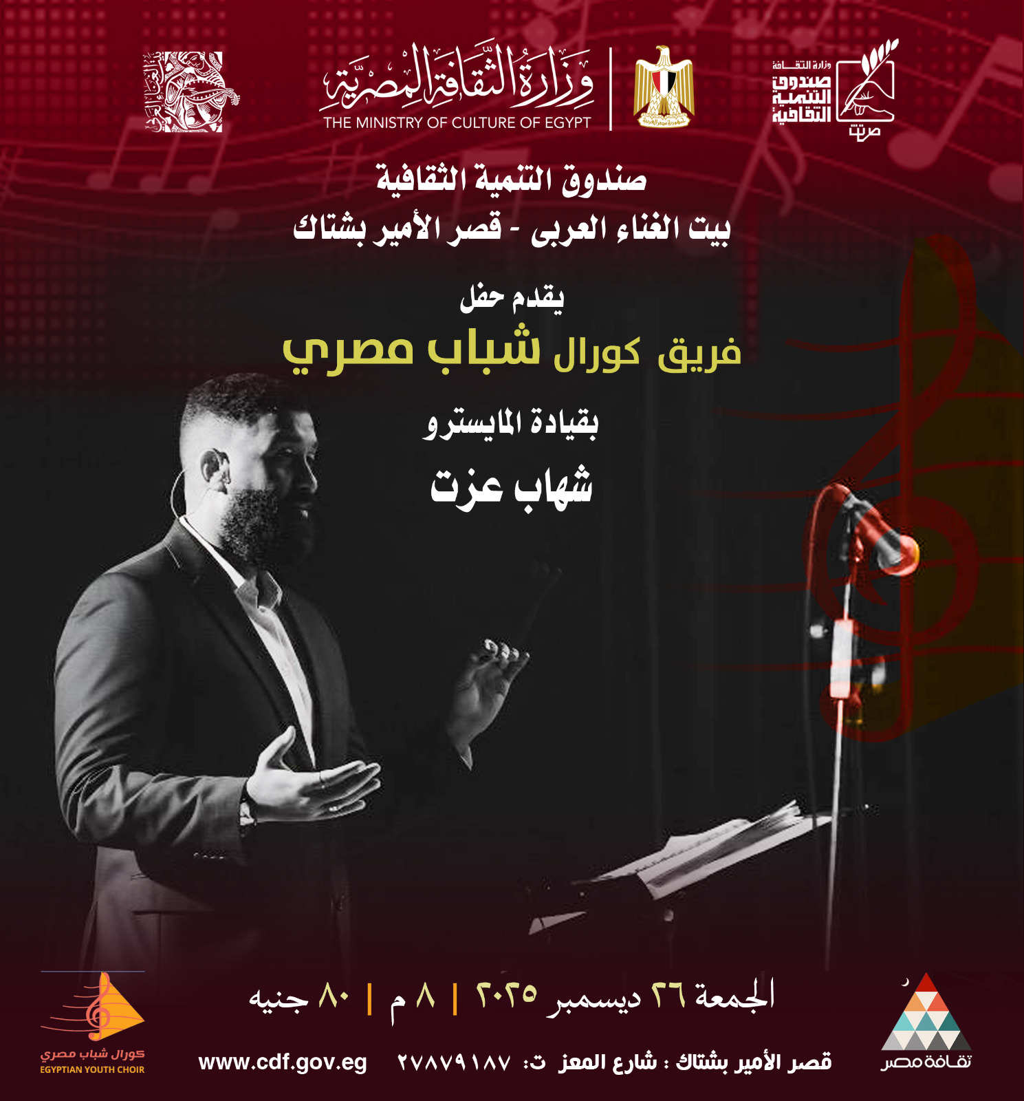 يقيم بيت الغناء العربي بقصر الأمير بشتاك، بشارع المعز لدين الله الفاطمي، حفلاً غنائياً جديداً لفرقة «كورال شباب مصري»، بقيادة المايسترو شهاب عزت، وذلك ضمن برنامج النشاط الفني الذي ينظمه صندوق التنمية الثقافية، في إطار دوره المستمر في دعم الفنون الجادة واكتشاف ورعاية الطاقات الإبداعية الشابة.