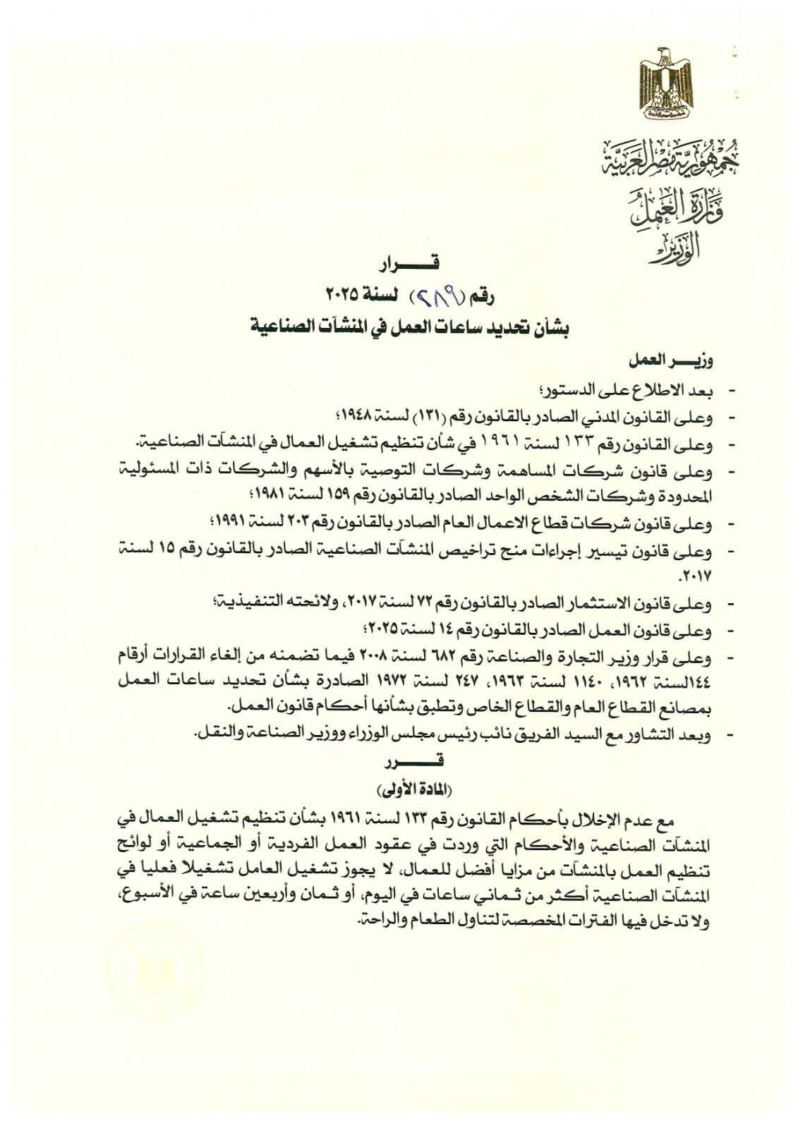 قرار رقم (289) لسنة 2025 بشأن تحديد ساعات العمل في المنشآت الصناعية.. بعد الاطلاع على الدستور، وعلى القانون المدني الصادر بالقانون رقم (131) لسنة 1948؛ وعلى القانون رقم (133) لسنة 1961 في شأن تنظيم تشغيل العمال في المنشآت الصناعية؛ وعلى قانون شركات المساهمة وشركات التوصية بالأسهم والشركات ذات المسئولية المحدودة وشركات الشخص الواحد الصادر بالقانون رقم (159) لسنة 1981؛وعلى قانون شركات قطاع الأعمال العام الصادر بالقانون رقم (203) لسنة 1991؛ وعلى قانون تيسير إجراءات منح تراخيص المنشآت الصناعية الصادر بالقانون رقم (15) لسنة 2017، وعلى قانون الاستثمار الصادر بالقانون رقم (72) لسنة 2017 ولائحته التنفيذية؛ وعلى قانون العمل الصادر بالقانون رقم (14) لسنة 2025؛ وعلى قرار وزير التجارة والصناعة رقم (682) لسنة 2008 فيما تضمنه من إلغاء القرارات أرقام 144 لسنة 1962، و114 لسنة 1963، و140 لسنة 1963، و247 لسنة 1972 الصادرة بشأن تحديد ساعات العمل بمصانع القطاع العام والقطاع الخاص وتطبيق بشأنها أحكام قانون العمل؛وبعد التشاور مع السيد الفريق نائب رئيس مجلس الوزراء ووزير الصناعة والنقل.