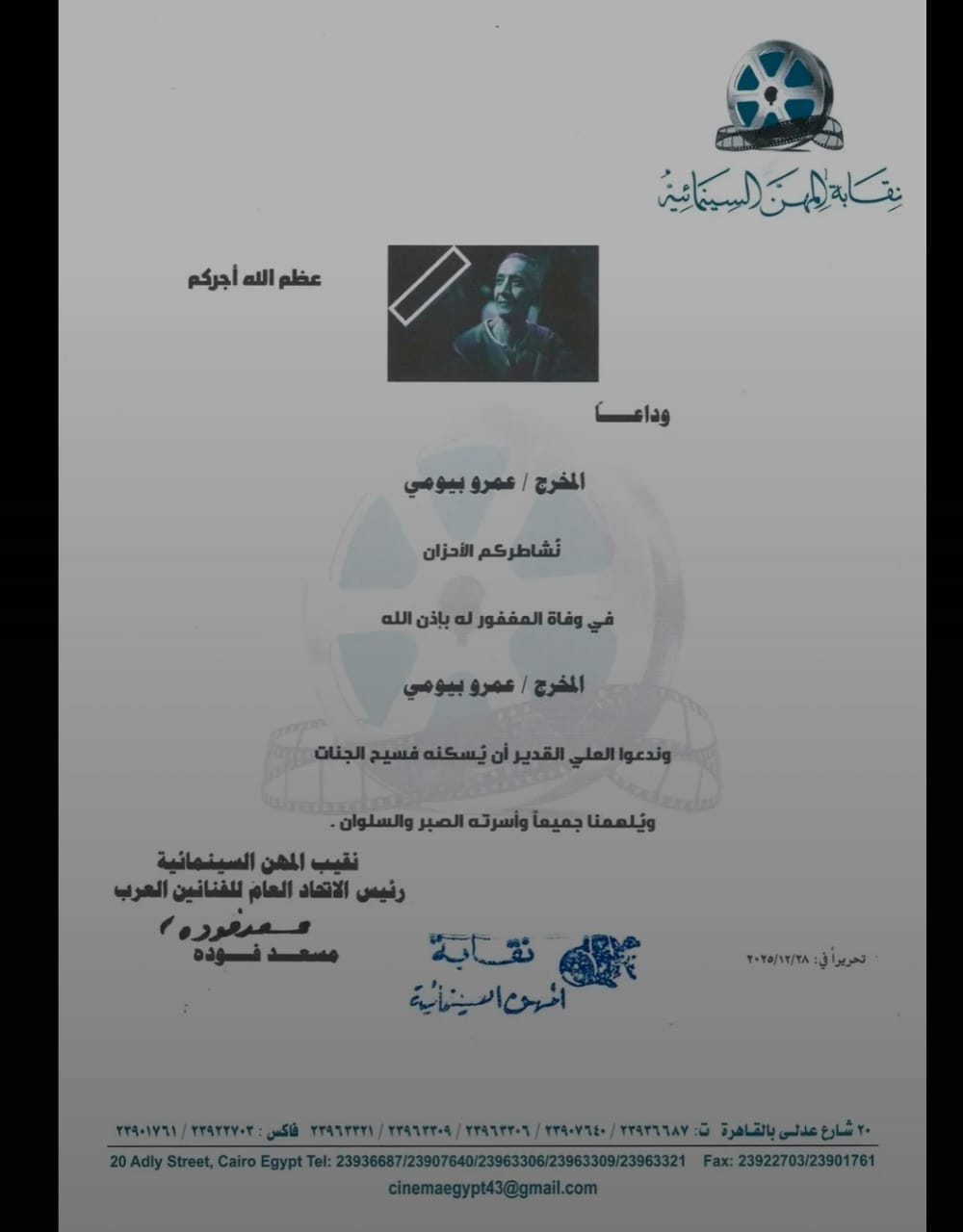 أعلنت نقابة المهن السينمائية عن تفاصيل عزاء المخرج عمرو بيومي، الذي وافته المنية اليوم، بعد مسيرة فنية حافلة في مجال الإخراج السينمائي.