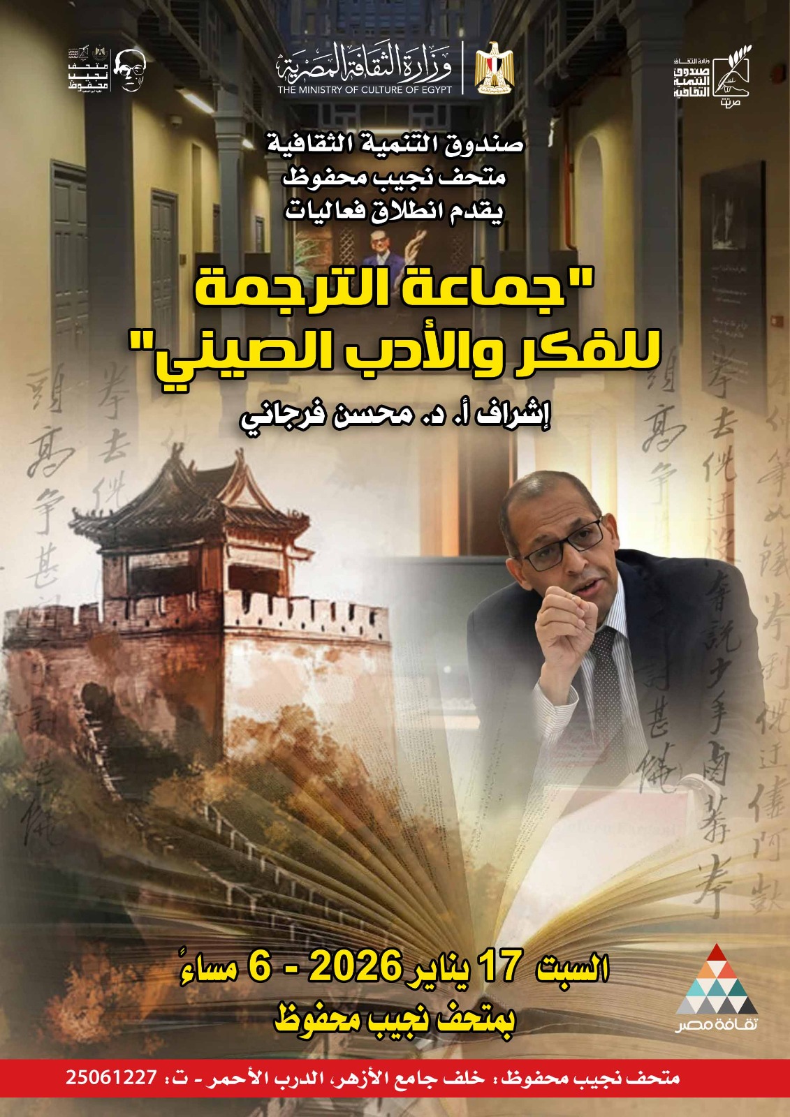 يشهد متحف ومركز إبداع نجيب محفوظ بتكية محمد أبو الدهب، التابع لقطاع صندوق التنمية الثقافية برئاسة المعماري حمدي السطوحي، إطلاق أولى فعاليات «جماعة الترجمة للأدب والفكر الصيني»، وذلك بإشراف الأستاذ الدكتور محسن فرجاني.