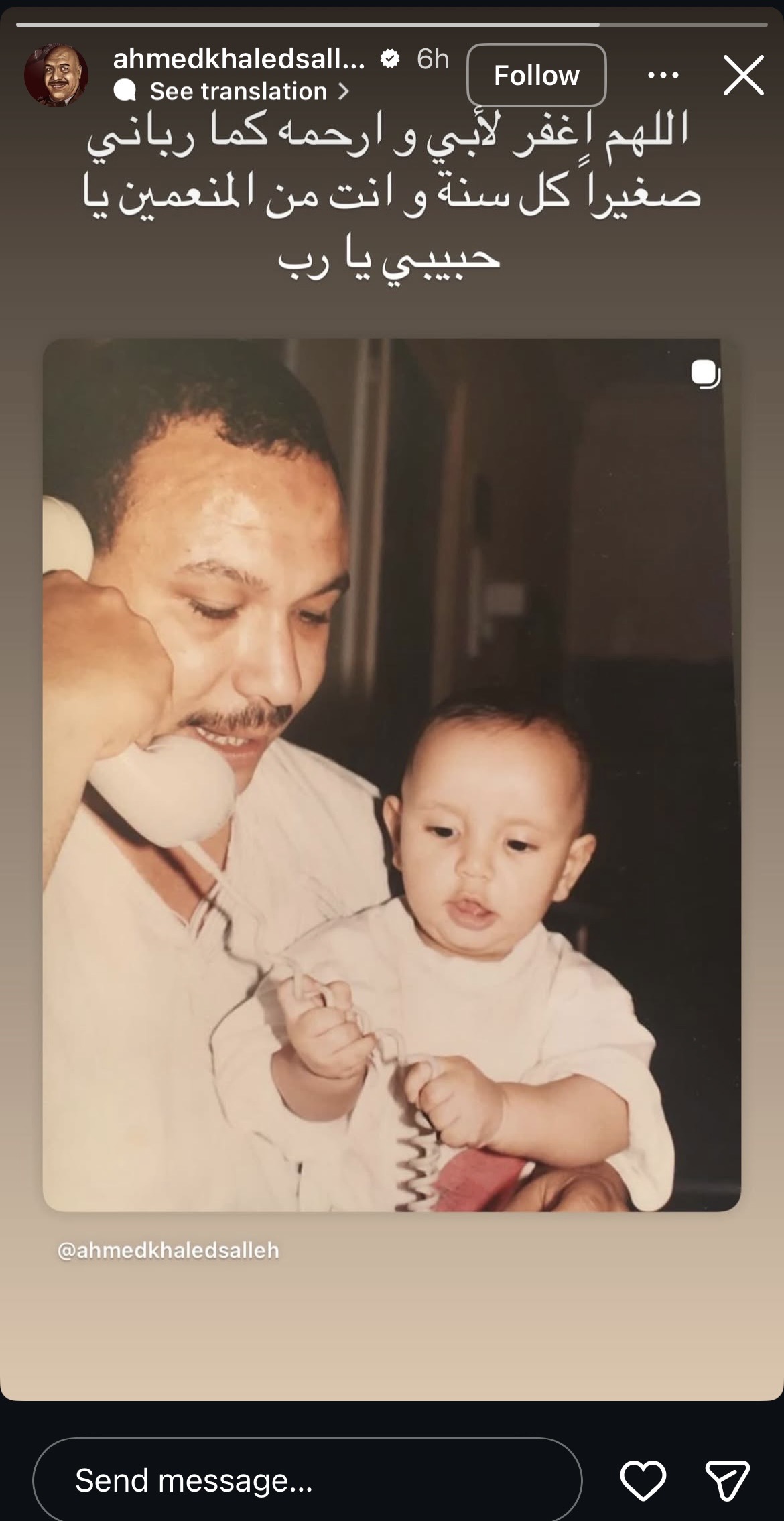 أحيا الفنان أحمد خالد صالح ذكرى ميلاد والده، الفنان الراحل خالد صالح، بكلمات مؤثرة نشرها عبر حسابه الرسمي على موقع «إنستجرام»، عبر فيها عن حبه وحنينه لوالده، داعيًا الله أن يتغمده بواسع رحمته.