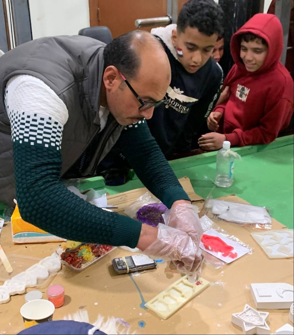 كما شهد اليوم استكمال ورشة الكونكريت وتعلم خلالها الأطفال طريقة الصب وخلط الألوان، فيما دربهم وائل شهاوي على تصميم ميداليات خلال ورشة الريزن، تلاها ورشة تصميمات فنية بخامات معاد تدويرها، وفقرة رسم على الوجه.